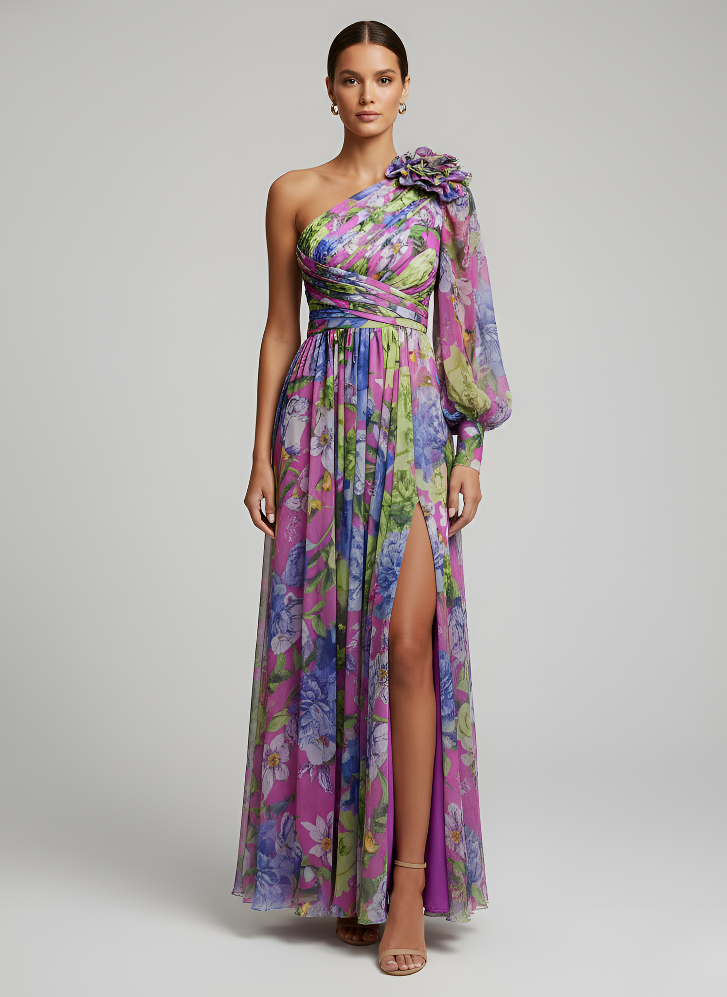 • Details: One-shoulder design, floral print, flower accent, side slit, maxi length