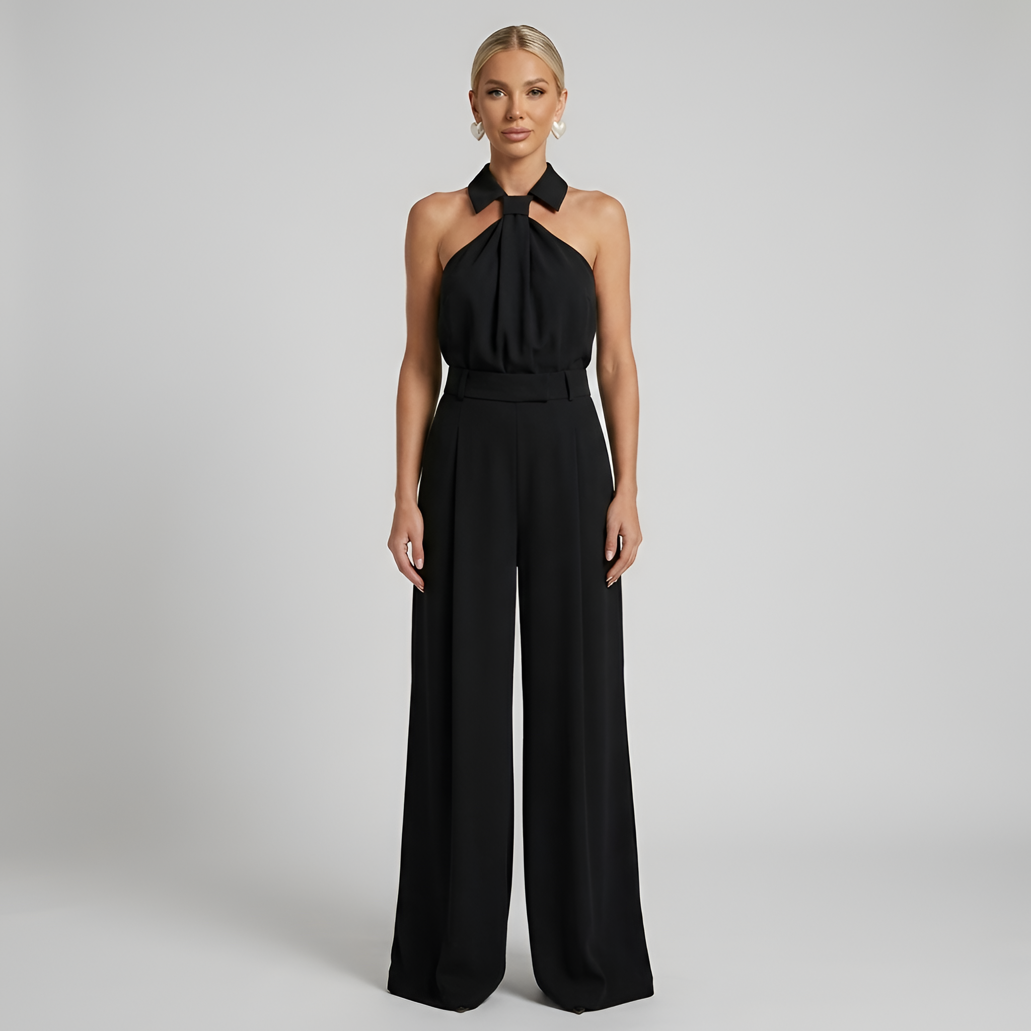 • Details: Halter neck, high-waisted, wide-leg design, zipper back