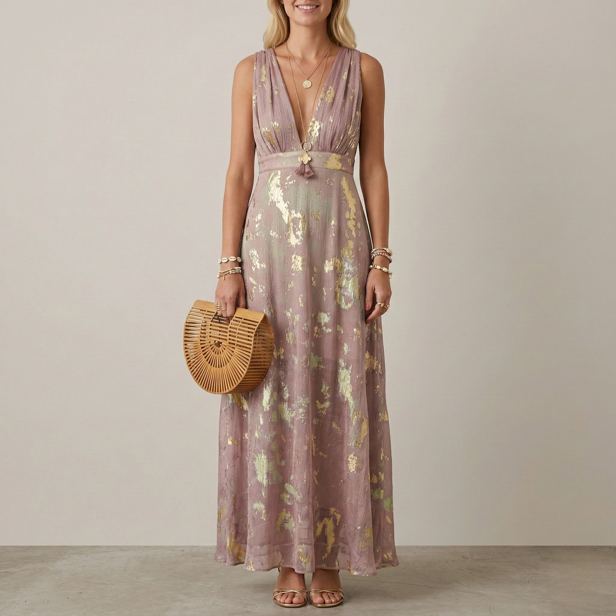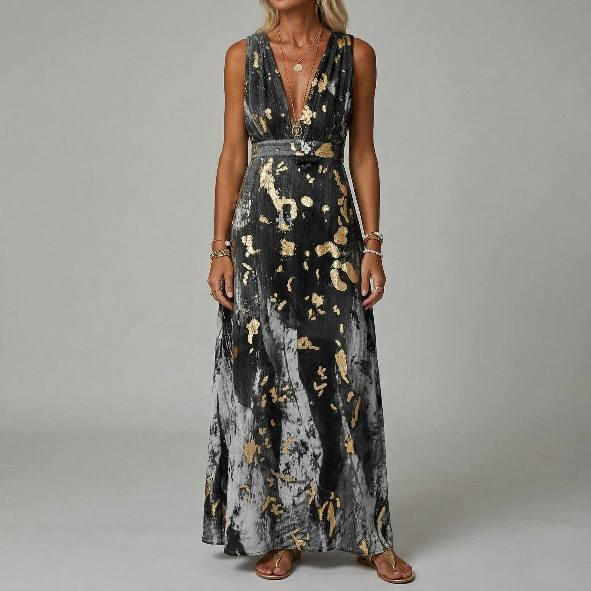 • Details: Deep V-neck, pleated skirt, floral pattern with golden detailing, maxi length