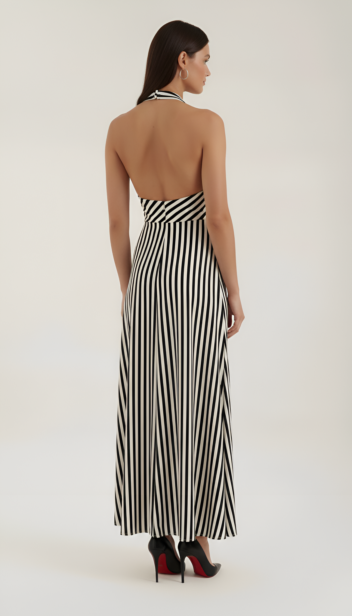 • Details: Halter neck, open back, striped pattern, maxi length