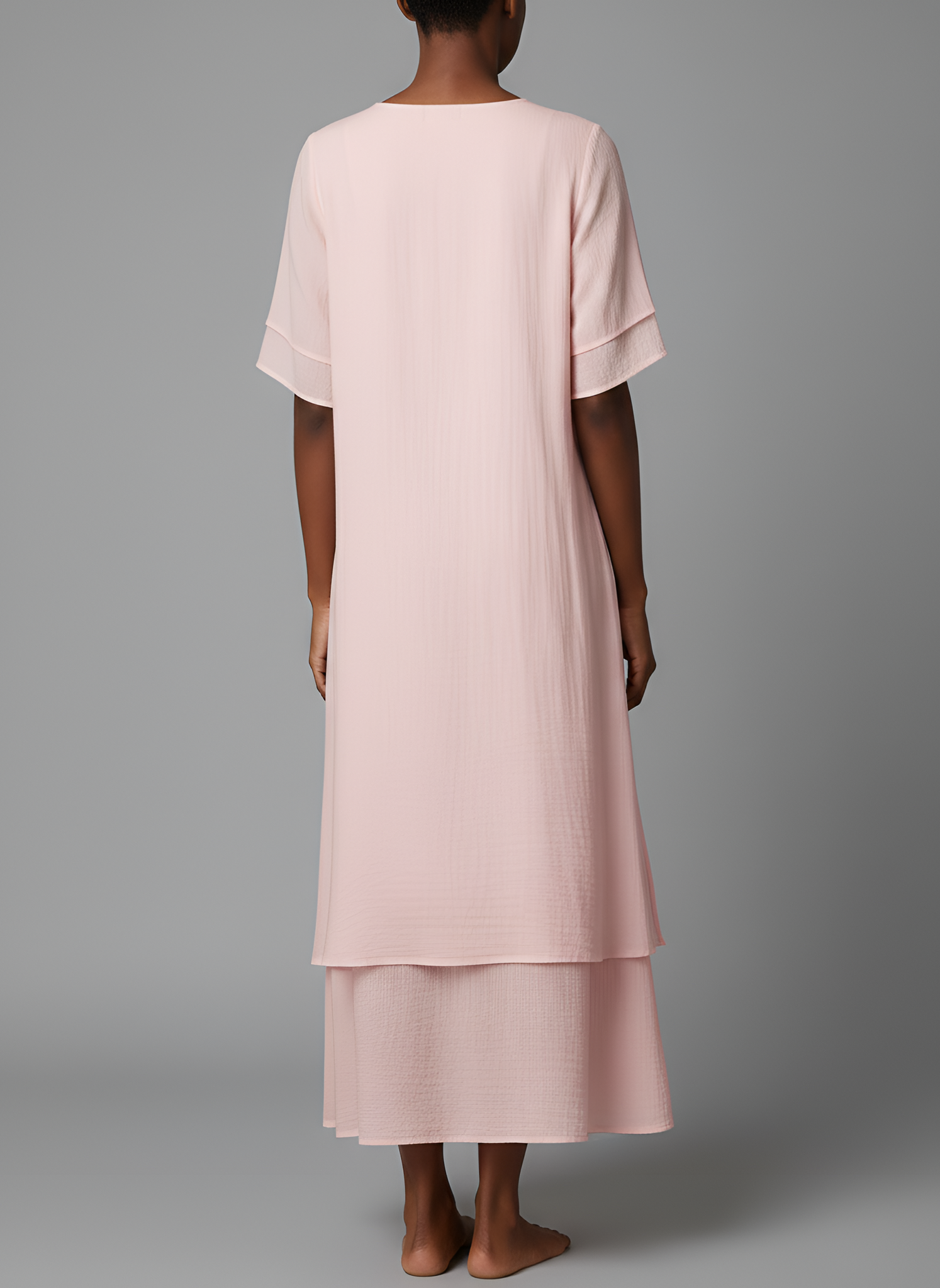 • Details: Round neckline, short sleeves, layered A-line design, midi length
