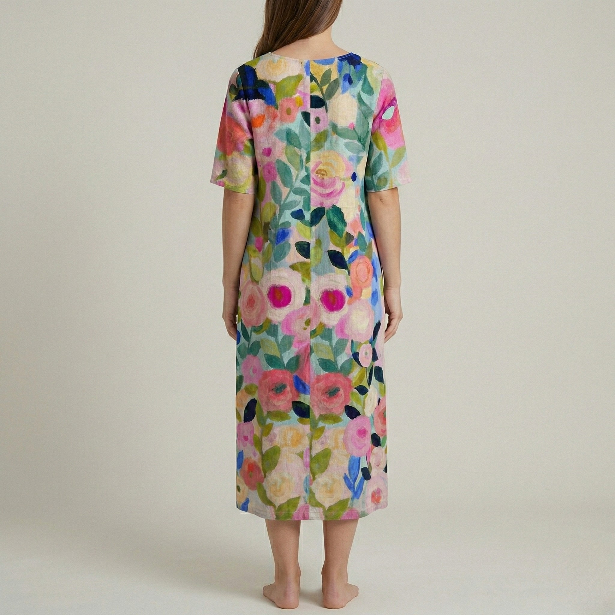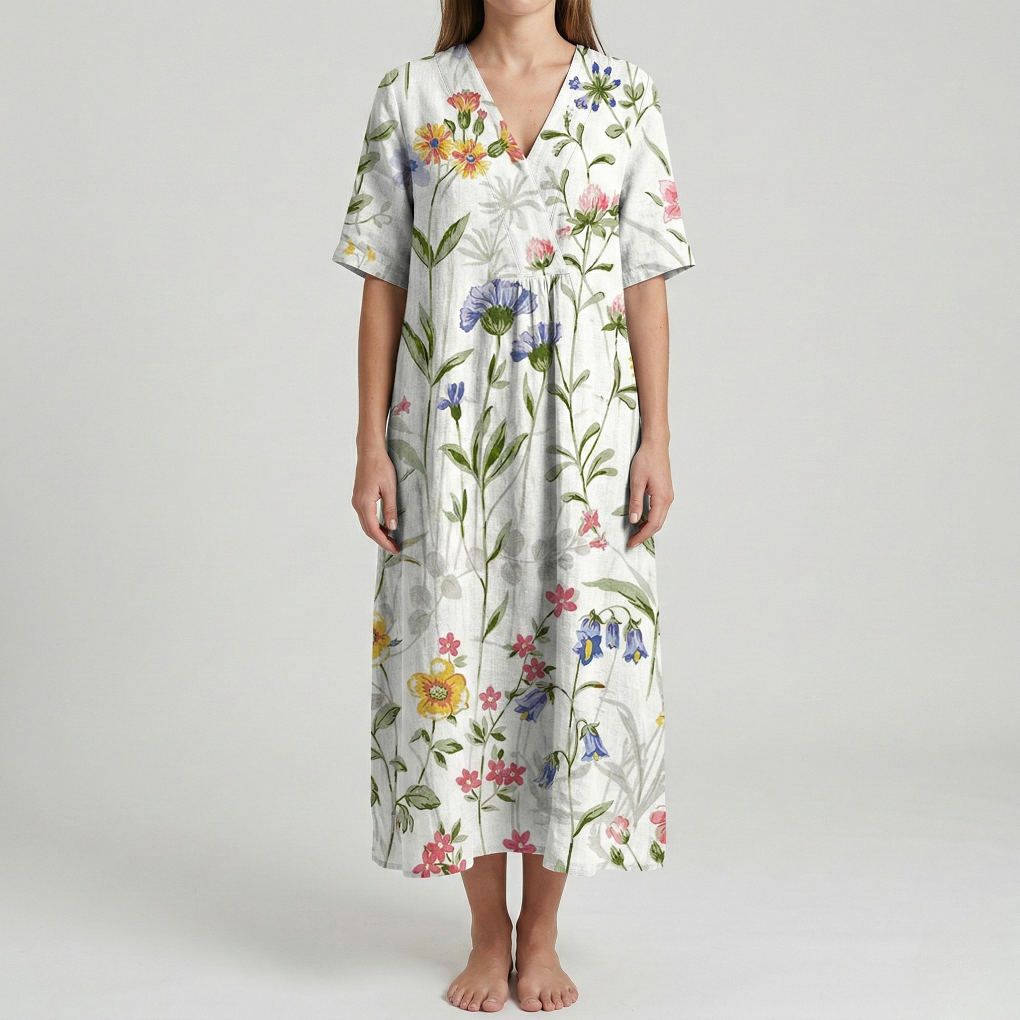 • Details: V-neck, short sleeves, colorful floral print, midi length
